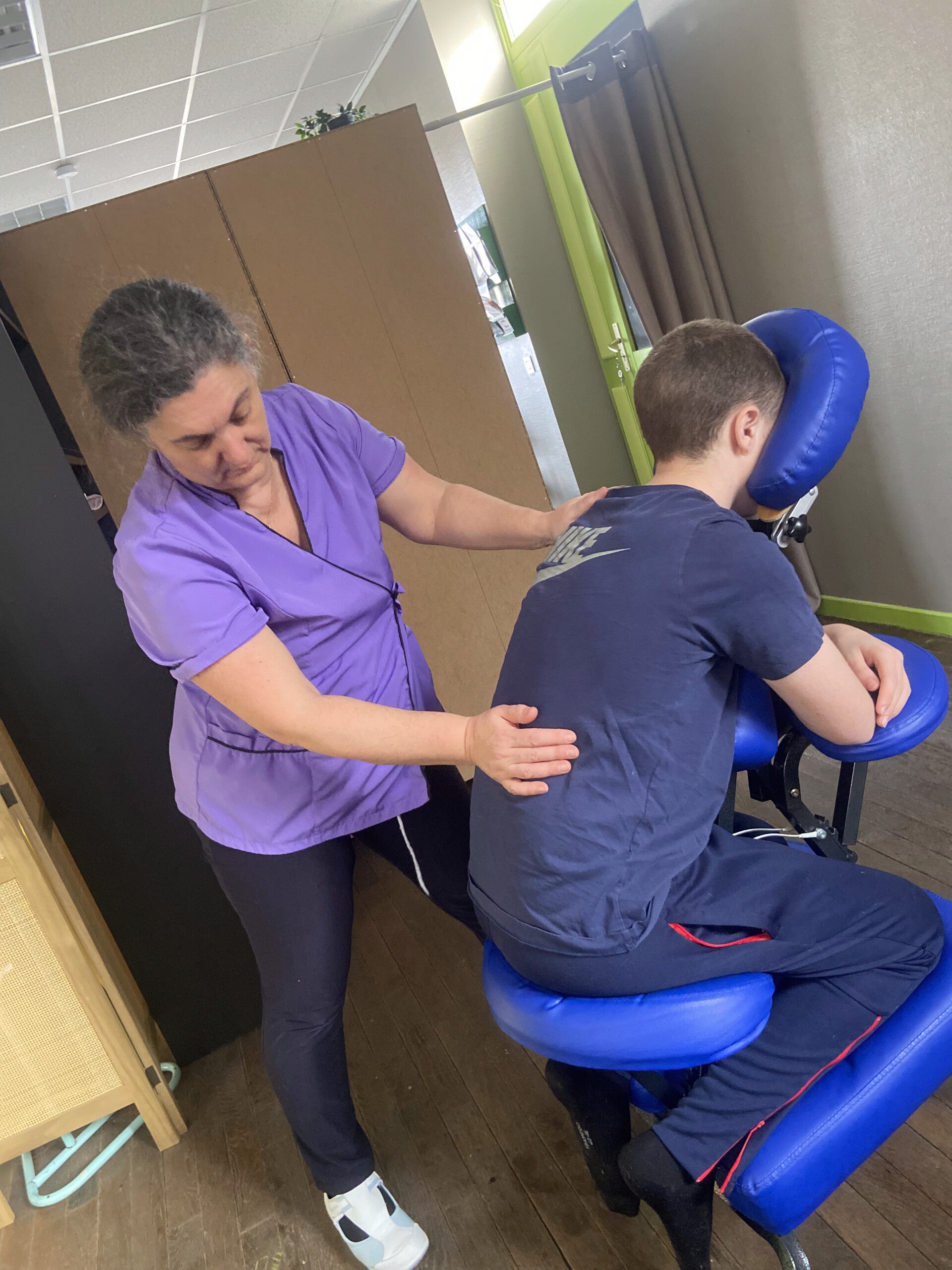 Massage rapide et efficace sur chaise, idéal pour relâcher les tensions du dos, des épaules et de la nuque.